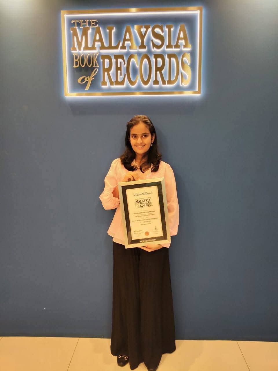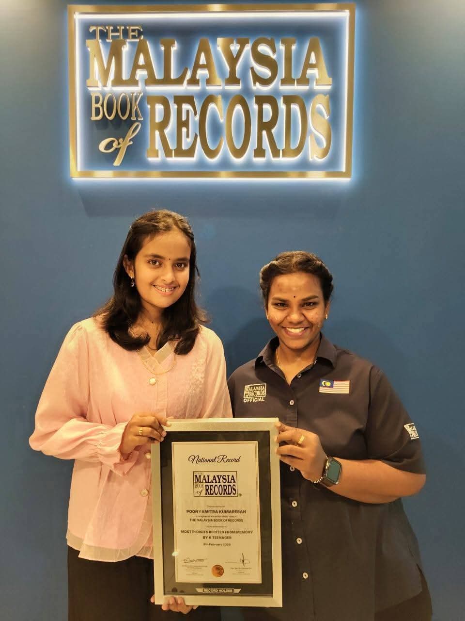 GEORGETOWN, 20th April - K. Poonyamitra, a Form Two student from SMK (P) St. George, has officially entered the Malaysia Book of Records (MBOR) for reciting the first 300 digits of Pi. She achieved this feat on February 9, 2026, earning the title for "Most Pi Recited from Memory by a Teenager."