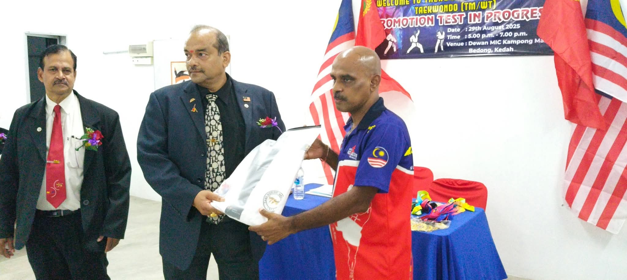 Taekwondo Malaysia (TM), in affiliation with World Taekwondo (WT), successfully conducted a Taekwondo promotion test on 29.8.2025 Friday at Dewan MIC Kampong Masjid, Bedong, Kedah. The event, which ran from 5:00 p.m. to 10:00 p.m., saw participants from various age groups and skill levels demonstrate their proficiency in Taekwondo techniques, forms, and sparring.
